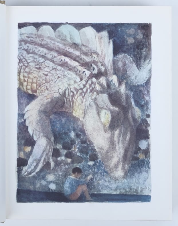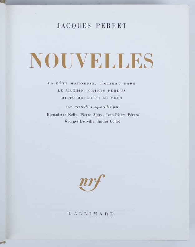 Ouvrage contenant : La Bête Mahousse, L'Oiseau rare, Le Machin, Objets perdus, Histoires sous le vent. Avec 32 reproductions hors texte d'aquarelles de Bernadette Kelly, Pierre Alary, Jean-Pierre Péraro, Georges Beuville et André Collot. Exemplaire n° 4522, avec un envoi de l'auteur au faux-titre : "à Jean-Pierre Lagrange, 1963 vengera 1962, le vœu est vehement, l'espoir est vague, bien amicalement, J. Perret".(Poids = 1,5 kg).