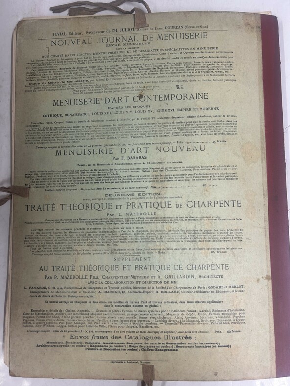 Deuxième édition revue et augmentée de 12 nouvelles planches de cet album composé de 99 planches (certaines en double), certaines en couleurs, d'ouvrages de menuiserie. * Membre du SLAM et de la LILA / ILAB Member. La librairie est ouverte du lundi au vendredi de 14h à 19h. Merci de nous prévenir avant de passer,certains de nos livres étant entreposés dans une réserve.