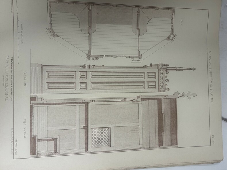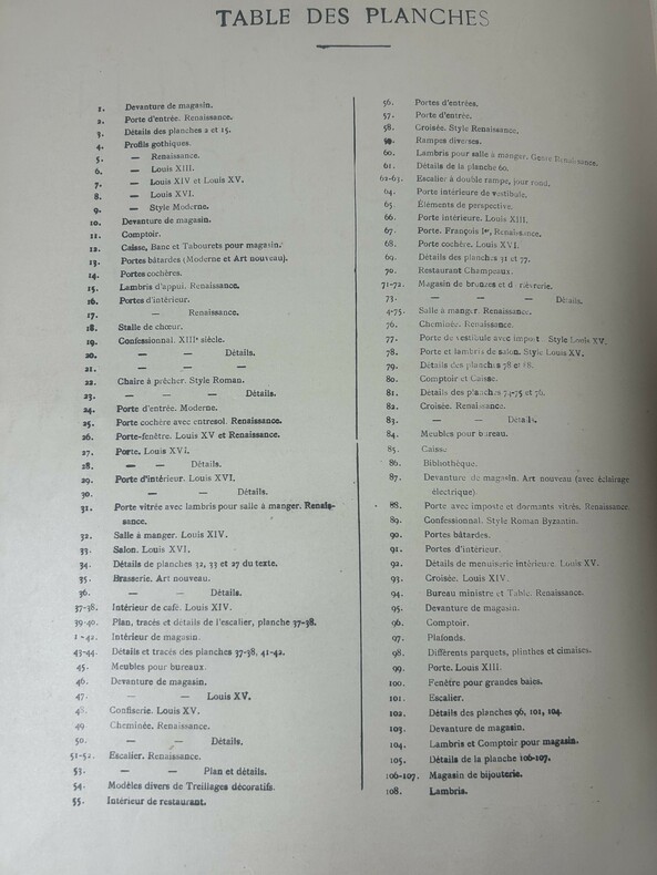 2e édition revue. Vers 1900. Avec la collab. d'architectes, d'entrepreneurs de menuiserie, professeurs de trait et de dessin de menuiserie, chefs d'atelier, etc. Devanture de magasin. Porte d'entrée, style Renaissance. Stalle de Choeur. Confessionnal (XIIIe siècle)... Classification Dewey : 720-Architecture