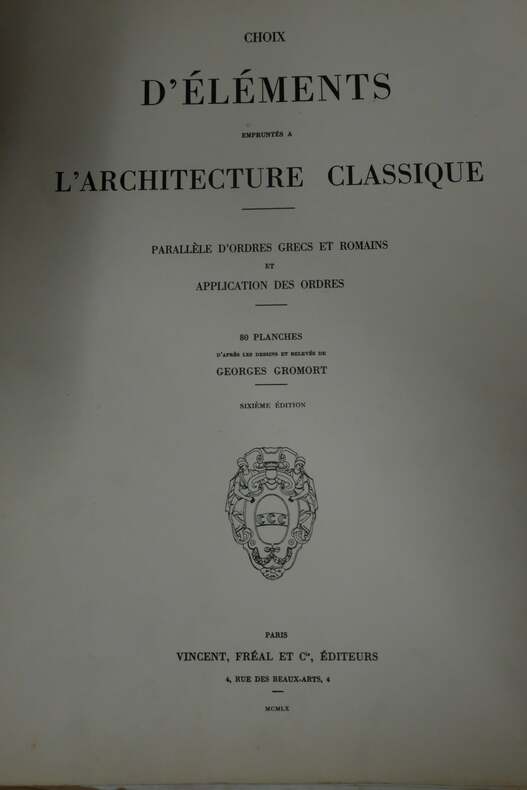 Chemise cartonnée, 80 planches d'après les dessins et relevés de Georges Gromort, sixième édition. Paru en 1960 chez Vincent, Fréal et Cie, Éditeurs. Très bon état général, intérieur frais.