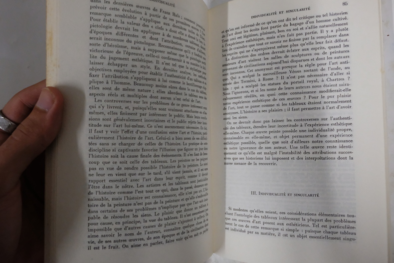 Paris, Librairie philosophique J. Vrin, "Problèmes et controverses", 1972, 13,5 x 21,5, 369 pages cousues sous couverture souple imprimée. Seconde édition. "Ce livre ne veut pas être une introduction philosophique à la peinture mais, au contraire, une introduction picturale à la philosophie. On ne s'y est pas proposé d'enseigner aux peintres l'art de peindre ; ils sont seuls à le connaître. Simplement, on a tenté de philosopher à partir d'un certain ordre de faits, qui sont les tableaux, pour en inférer des conclusions d'ordre philosophique et ainsi nommer sans inexactitude "ontologie de la peinture" l'ordre de recherches où nous nous proposons d'entrer."