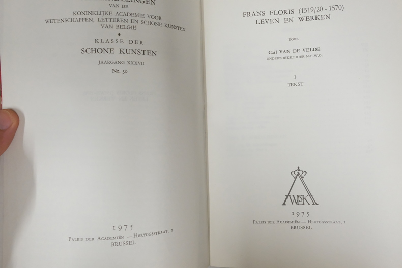 Brussel, Paleis der Academiën 1975 Volledig in 2 delen, I: xvi,555pp., II: 342 zw/w illustraties, in de reeks "Verhandelingen van de Koninklijke Vlaamse Academie voor Wetenschappen, Letteren en Schone Kunsten van België. Klasse der Schone Kunsten" nr.30 verhandeling (Jg.37), gebroch., met stofwikkels, 26cm., goede staat, bevat catalogue raisonné van Floris' werken, zeldzaam, [Monography and 'catalogue raisonné' on the Flemish painter Frans Floris, complete in 2 volumes and in good condition, rare], S85819