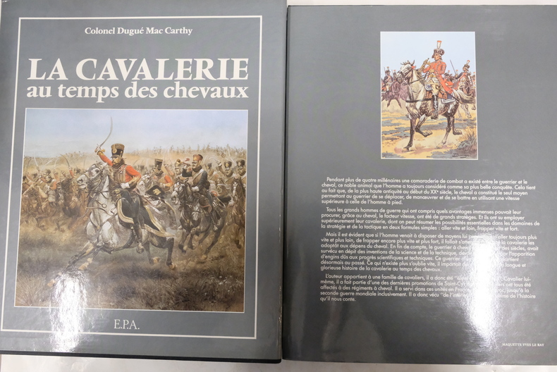 # AUTEUR: Dugué Mac Carthy # ÉDITEUR: Edition presse audiovisuel # ANNÉE ÉDITION: 1989 # COUVERTURE: cartonnée marron - titre doré - sous jaquette ill. couleurs et emboitage # DÉTAILS: In 4° relié 327pp. Naissance et évolution de la cavalerie au cours des siècles. XL hors texte en couleurs et nombreuses illustration en noir. # PHOTOS visibles sur www.latourinfernal.com