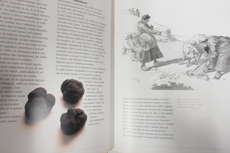 Rare édition originale extrêmement recherchée de ce petit manuel romantique consacré à l’étude de la truffe. Vicaire, Bibliographie gastronomique, 570; Bitting 312. L’auteur y aborde de nombreux sujets tels que l’histoire de la truffe, le choix du lieu destiné à l’établissement d’une truffière, de la semence, des soins à donner aux truffes, des animaux nuisibles aux truffes, des usages et effets des truffes, des truffes dans leurs rapports à l’art culinaire, de la conservation des truffes, de la culture des champignons en général, de l’empoisonnement par les champignons, etc. Le présent manuel est illustré d’une très belle planche gravée dépliante coloriée d’après H. Monnier, mettant en image un dialogue entre Madame Chevet, un gastronome et un «auteur» retranscrit en guise d’avant-propos. Précieux exemplaire en parfait état de conservation.