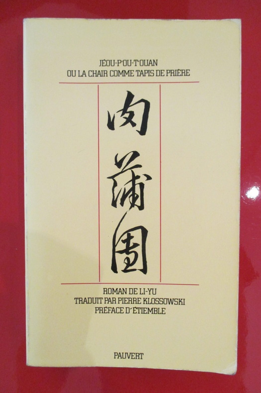 "JEOU - P'OU - T'OUAN ou La chair comme tapis de prière, roman écrit vers 1640 par le lettré Li-Yu, a été traduit en français pour la première fois par Pierre Klossowski et fut publié par Jean-Jacques Pauvert en 1962. La traduction de Pierre Klossowski est établie sur l'édition originale chinoise signalée au Catalogue des romans populaires chinois de Souen K'ai-ti. Grâce à l'aimable autorisation de Jean-Jacques Pauvert, éditeur, nous pouvons reproduire dans notre ouvrage l'essentiel de cette version.""Achevé d'imprimer pour le texte, le dix-huit mai mil neuf cent soixante et onze sur les presses de Jean Paul Vibert, à Grosrouvre dans les Yvelines. Les lettrines sont une création originale de Yvette Vibert. - Le tirage en noir des illustrations est dû aux ateliers "Arte", d'Adrien Maeght. La gravure sur bois et le tirage en couleurs des compositions de Brenot sont l'uvre de Raymond Jacquet. Les cinq peintures chinoises de la collection Roger Peyrefitte ont été reproduites en couleurs, au pochoir à la main, par Maurice Beaufumé. Le laque qui décore la reliure exécutée par la Reliure d'Art "Au Poinçon d'Or", est de Gérard Lejeune. - Cet ouvrage est une réalisation de Yvan François Wils."