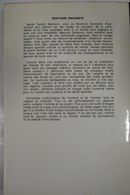 Dans ce cortège, côte à côte voici nos animaux familiers, chiens, chats, chevaux, et d'autres qui le sont moins, panthère, vipère, tamanoir. Ensemble, ils forment un bestiaire enchanté qui a ses stars - la chenille, la grenouille, l'oie - et ses fans, car, comme il y a des peintres animaliers, il y a des poètes animaliers. Aussi des noms reviennent-ils plus que d'autres : Les Histoires naturelles de Jules Renard, les Fables de mon jardin de Georges Duhamel. À les lire, on est frappé de la parfaite harmonie qui règne dans ce mariage entre l'artiste et son sujet, et une idée vient, irrésistible : il se pourrait bien que les bêtes aiment les poètes. Très bon état d’occasion