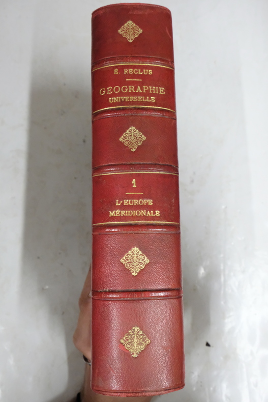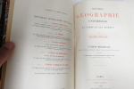 Contenant: 73 gravures, 4 cartes en couleur tirées à part et 174 cartes intercalées dans le texte. Paris, Librairie Hachette et Cie, 1883. In-octavo (28x6x19cm) cartonnage éditeur dit ''Maçonnique'', dos à 4 nerfs orné d'instruments de mesures et de motifs dorés, plats ornés d'un semis de fers à froid dans un triple encadrements de filets dorés, avec au centre une grande composition rouge et noire et or, un globe terrestre doré au milieu d'une rose des vents de navigations (plaque de Souze Relieur), tranches dorées, quelques petites éraflures sur les coiffes et les charnières. 1012pp.