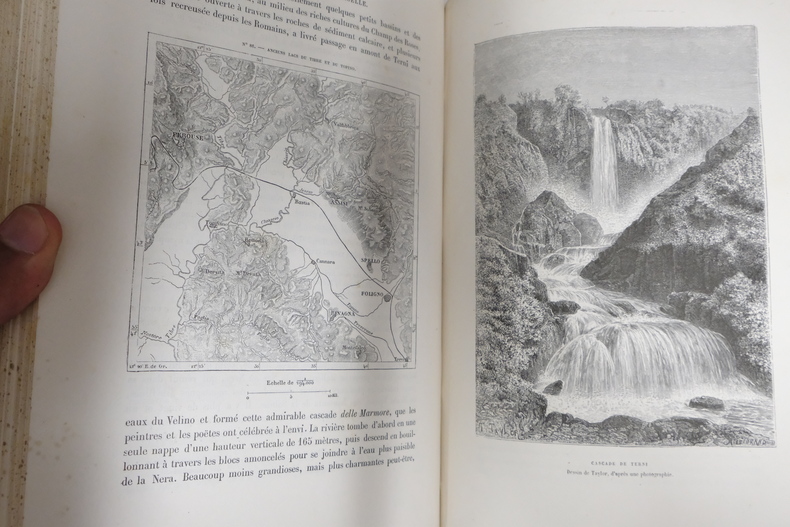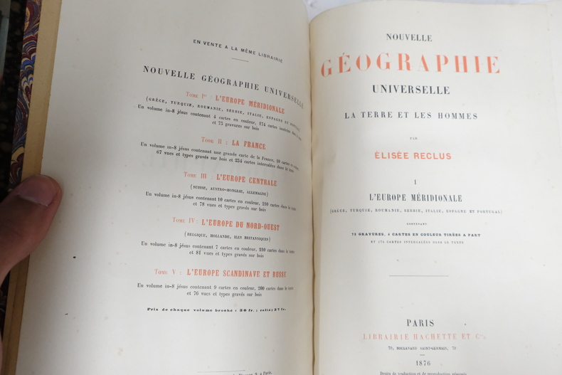 Relié dos demi-cuir rouge et doré, grand in-4, paru en 1876 chez Hachette & Cie, contenant 73 gravures, 4 cartes en couleurs tirés à part et 174 cartes intercalés dans le texte, bon état général, quelques légères rousseurs et marques d'humidités à l'intérieur, reliure partiellement frottée, pages du chapitre 1 volantes. Nous possédons d'autres volumes de la même collection.