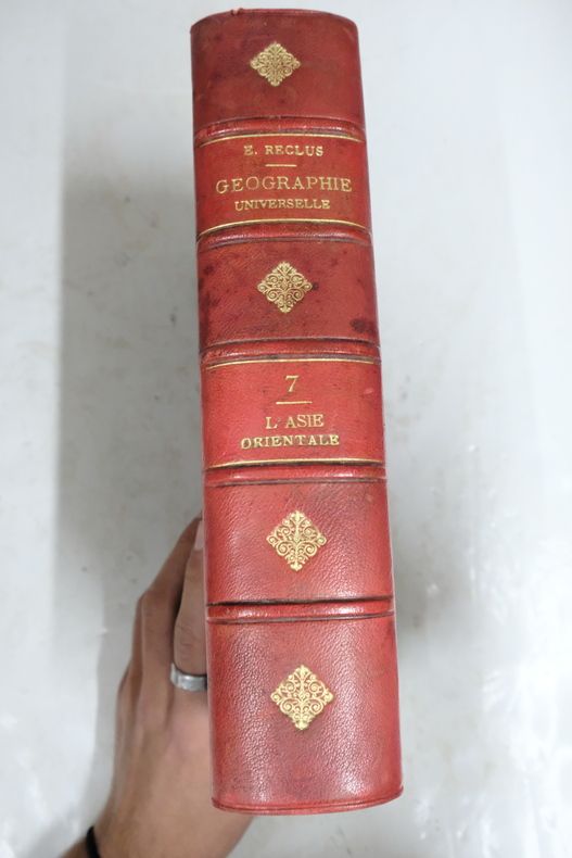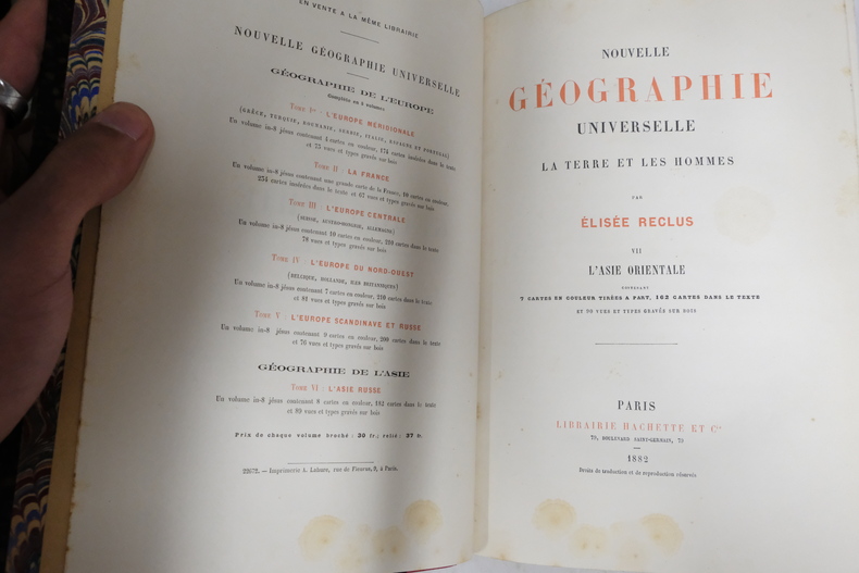 Relié dos demi-cuir rouge et doré, grand in-4, paru en 1882 chez Hachette & Cie, contenant 7 cartes en couleur tirées à part, 162 cartes dans le texte et 90 vues et types gravés sur bois, très bon état général, quelques légères rousseurs et marques d'épidermures, reliure en bon état. Nous possédons d'autres volumes de la même collection.