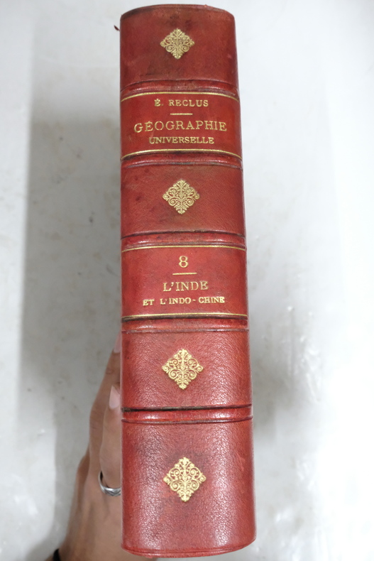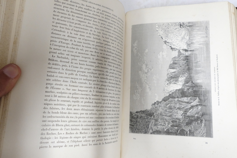 Relié dos demi-cuir rouge et doré, grand in-4, paru en 1883 chez Hachette & Cie, contenant 7 cartes en couleur tirées à part, 203 cartes dans le texte et 90 vues et types gravés sur bois, très bon état général, quelques légères rousseurs et marques d'épidermures ( certaines pages sont plus marquées que d'autres ), reliure en bon état. Nous possédons d'autres volumes de la même collection.