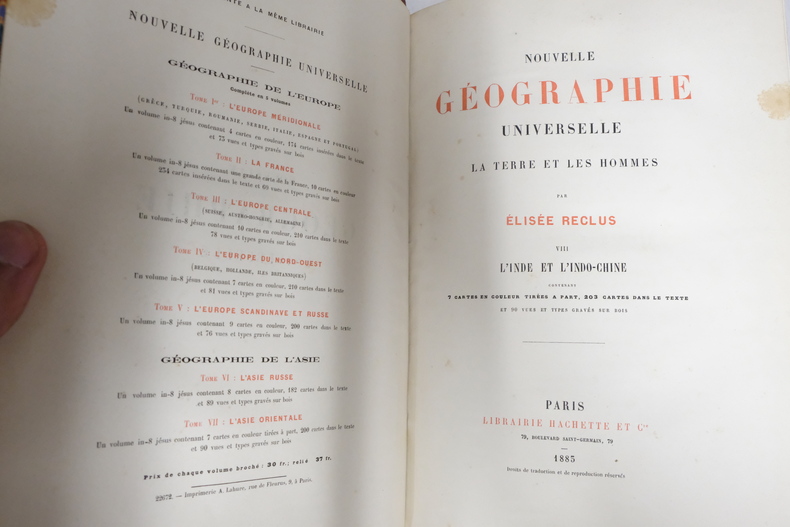 1876-1894 Librairie Hachette, Paris, 1876-1894. 19 volumes in-4 reliure demi chagrin . Titre doré au dos. Très nombreuses gravures et cartes dans le texte + cartes en couleurs tirées à part.