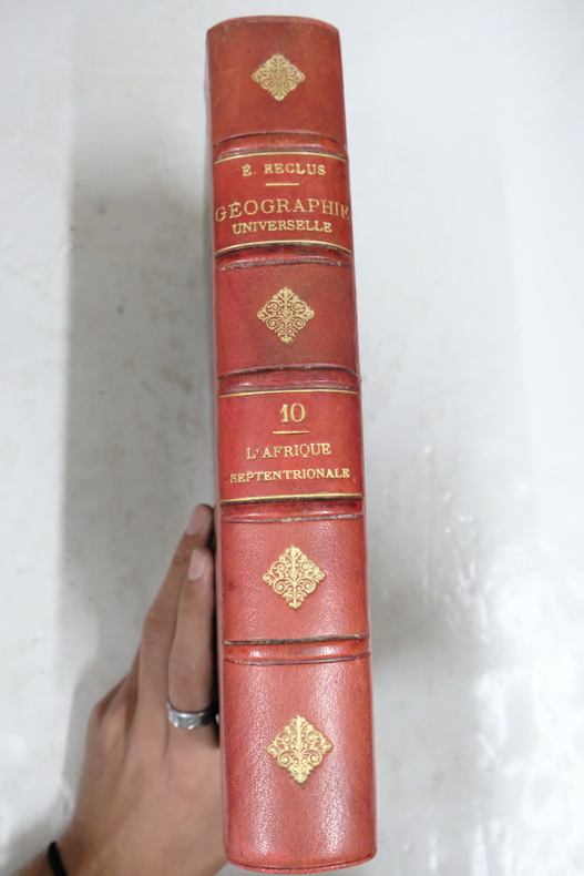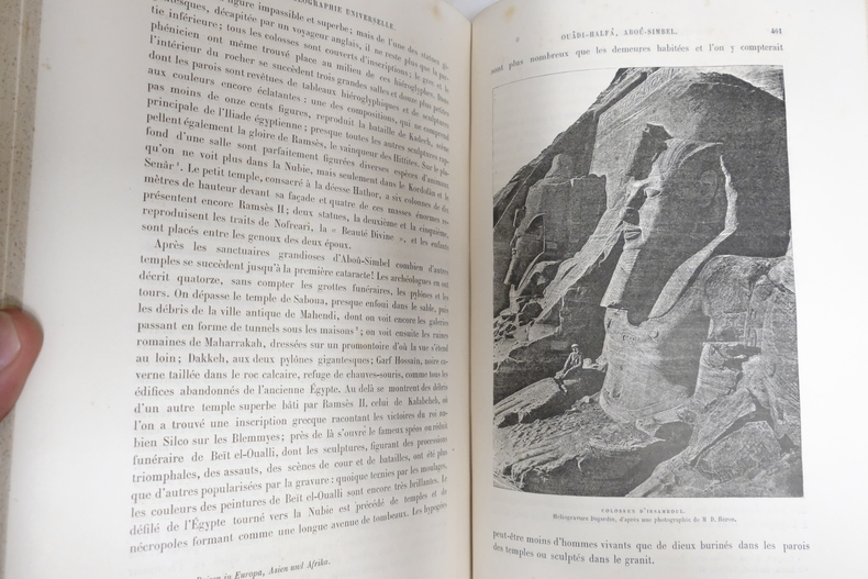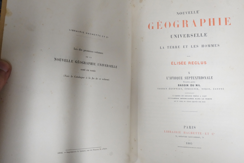 Paris, Hachette, 1885. 20 x 29, 639 pages, 3 cartes en couleurs tirées à part, 111 cartes dans le texte, 57 gravures, reliure dos/coins cuir, 5 nerfs, caissons avec 1 décor de rinceaux, filets, bon état (pied et coiffe légèrement abîmés, rousseurs, cachets du collége jésuite Saint-Stanislas à Mons).