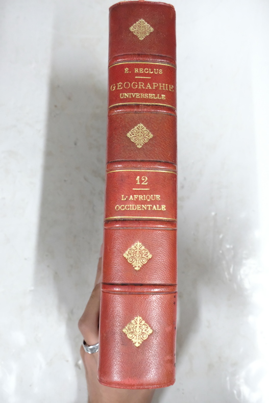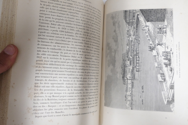 Relié dos demi-cuir rouge et doré, grand in-4, paru en 1887 chez Hachette & Cie, contenant 5 cartes en couleur tirées à part, 126 cartes intercalés dans le texte et 65 vues et types gravés sur bois, très bon état général, quelques légères rousseurs et marques d'épidermures ( certaines pages sont plus marquées que d'autres ), reliure en bon état. Nous possédons d'autres volumes de la même collection.