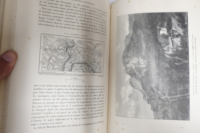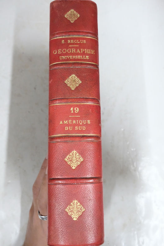 Relié dos demi-cuir rouge et doré, grand in-4, paru en 1894 chez Hachette & Cie, contenant 5 cartes en couleur tirées à part, 169 cartes intercalés dans le texte et 62 vues et types gravés sur bois, très bon état général, quelques rousseurs et marques d'épidermures ( certaines pages sont plus marquées que d'autres ), reliure en bon état. Nous possédons d'autres volumes de la même collection.