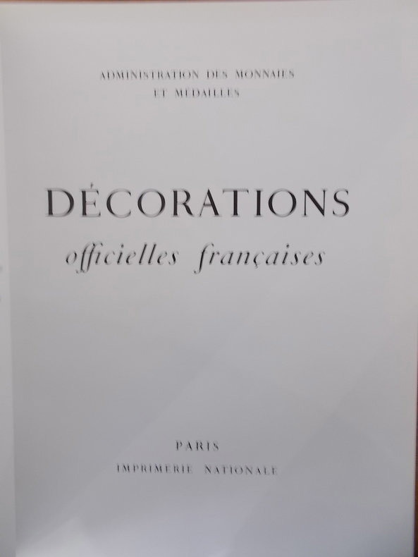 Bel ouvrage, abondamment illustré, publié sous les auspices de l'Administration des Monnaies et Médailles, présente tous les modèles de décorations officielles françaises contemporaines, avec leurs caractéristiques et leurs conditions d'attribution à titre civil ou militaire. ......RARE.......en bon état(good condition). en bon état