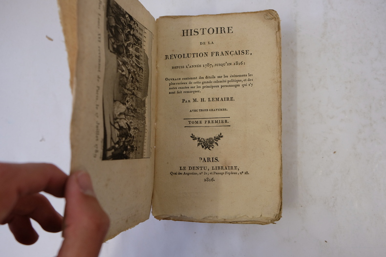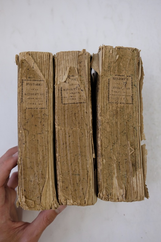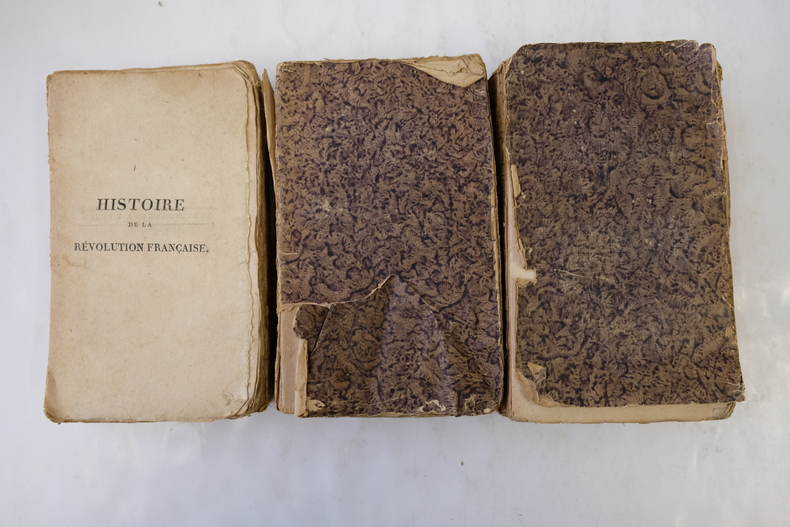 3 volumes aux couvertures de papier gris-marbré d'époque, défraichie, traces d'étiquettes papier ; 425pp+461pp+541pp ; Ouvrage contenant les détails sur les évènements les plus curieux de cette grande calamité politique, et des notes exactes sur les principaux personnages qui s'y sont fait remarquer ; cet ouvrage est rare, à toutes marges en brochage d'origine, sauf erreur, il ne figure pas les 3 planches HT annoncées