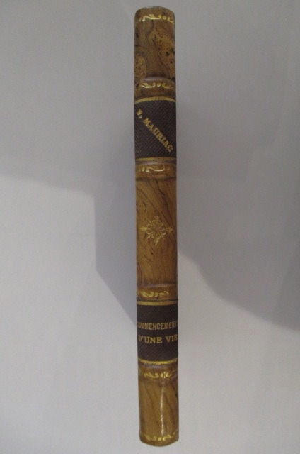 Commencement d’une vie » est un récit autobiographique publié en 1932 dans lequel il fait le récit rétrospectif de son histoire mais aussi écrit un témoignage de toute une époque et une société. " Mauriac explore les débuts de la vie de son protagoniste, et plus particulièrement son adolescence et sa jeunesse. Le roman suit les tourments et les questionnements intérieurs du personnage principal, ses doutes, ses espoirs, ses premières amours, et ses confrontations avec la religion, la morale et les conventions sociales. Le thème de l'identité et de la quête de soi est au cœur de l'œuvre, et l'auteur peint avec finesse et subtilité les luttes intérieures de son personnage, tout en faisant résonner les thèmes universels de la condition humaine. Comme beaucoup d'œuvres de François Mauriac, "Commencements d'une vie" explore les profondeurs de la psychologie humaine, mettant en lumière les conflits moraux, les dilemmes et les passions qui animent ses personnages. L'écriture de Mauriac est reconnue pour sa profondeur émotionnelle et son analyse subtile des nuances de la nature humaine, faisant de ce roman une lecture enrichissante pour ceux qui s'intéressent à la littérature française du XXe siècle. Vol in-8, 180x120, superbe reliure demi cuir, tranche de tête dorée, parfait état intérieur, 129pp. Couvertures d'origines conservées. Exemplaire numéroté sur vélin de Loraine 14/330 Paris Grasset, 1932. Edition Originale. ref/C29