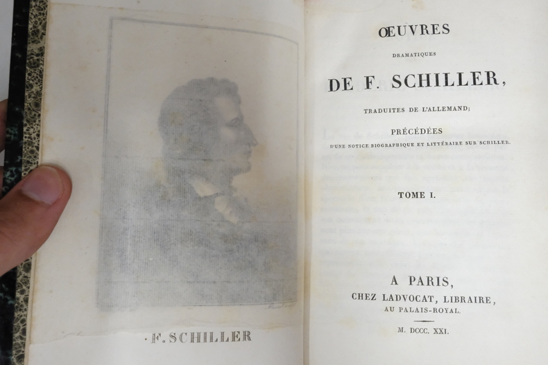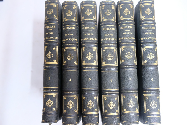 Ladvocat | Paris 1821 | 13 x 21 cm | 6 Volumes reliés | Edition originale collective dans la traduction française du baron Prosper Brugière de Barante. Un portrait lithographié au frontispice. Longue notice sur la vie et les écrits de l'écrivain. Cette entreprise de traduction est la première qui se veut exhaustive du théâtre de Schiller. Elle fut déterminante pour la connaissance de l'écrivain en France, qui ne connut une nouvelle traduction complète de son théâtre qu'en 2005. Reliure en demi-chagrin doré. Livres en très bon état général, de très légères rousseurs en intérieur, quasi anodines. Les reliures présentent pour certaines quelques légers défauts comme des émoussements et des pliures peu dérangeantes. Contient : Les brigands, La conjuration de Fiesque, L'intrigue et l'amour, La pucelle d'Orléans, Marie Stuart, Le camp de wallenstein, Les Piccolomini, La mort de Wallenstein, La fiancée de Messine, Guillaume Tell, L'hommage des arts, Le misanthrope, Don Carlos, Demetrius.