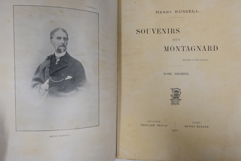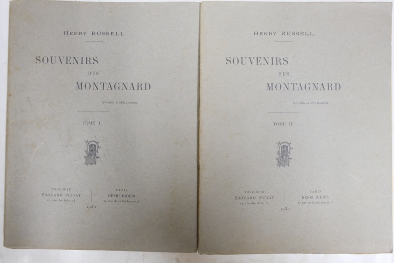 Deux tomes en deux volumes in 8 broches 185x240 mm. Tome 1 faux titre portrait de l auteur en frontispice titre VIII presentation du docteur Sabatier 394 pages 9 illustrations photos hors texte. Tome 2 faux titre frontispice Gavarnie statue du Comte Henry Russell 11 illustrations photos hors texte 390 pages. Toulouse Edouard Privat Paris Henri Didier 1930. Edition la plus complete. Photos de Arland Meys Gaurier Meillon Ritter Robach. Tres bon etat.