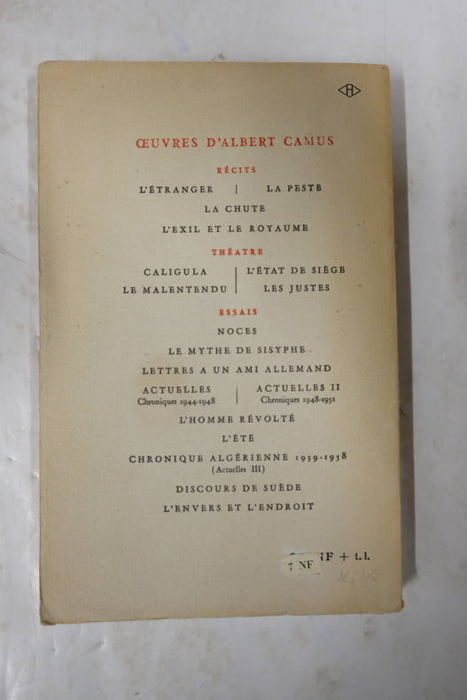 First edition, Service de presse-copy, i.e. review-copy (""S.P"" to bottom of title-page and to verso of back wrapper), with an excellent presentation-inscription, of Camus' magnificent and highly influential collection of essays entitled ""Summer"". The copy is inscribed to Camus' close friend and ally in numerous respects, Jean Paulhan: ""a Jean Paulhan/ en affectueuse pensée/ Albert Camus"" on half-title. The famous French writer, literary critic and publisher Jean Paulhan (1884-1964) shared many things with Camus, with whom he grew very close. Not only did he participate actively in the publication of Camus' first books by Gallimard, was one of the first to see the true value of Camus' ""The Stranger"", he was also a confidante of Camus, who considered Paulhan one of the main reasons that he became a proper author. In a letter to Paulhan dated September 17, 1952, at the moment of break with Sartre, Camus writes: ""Ever since I (thanks to you) became what is called an author, I have not ceased to be astonished by my brethren. Sometimes, it is true, in the sense of admiration. Today it is in another sense."" (Depuis que je suis devenu (en peu grâce à vous) ce qu'on apelle écrivain, je n'ai pas cessé d'être étonné par mes confrères. Parfois dans le sens de l'admiration, il est vrai. Aujourd'hui c'est dans un autre sens.).Paulhan was an early and active member of the French Resistance, director of the literary magazine Nouvelle Revue Française (NRF) (from 1925 to 1940 and again from 1946 to 1968) and a great translator of Malagasy poetry, which attracted the interest of the likes of Guillaume Apollinaire and Paul Éluard. He also wrote numerous works of literary criticism, ""The Flowers of Tarbes, or Terror in Literature"" (1941) probably being the most famous, and he wrote several autobiographical short stories. After the war, Paulhan he founded ""Cahiers de la Pléiade"", and in 1953 he re-launched NRF.Interestingly, especially in connection with Camus' famous essays in ""L'été"", which are devoted entirely to his beloved Algiers, Paulhan was loudly against independence for Algeria. He caused great controversy by opposing independence and supporting the French military during the Algerian War. This not only caused public problems for him, it also cost him on the personal front, as for instance Maurice Blanchot denounced him. The essays in ""L'été"" are devoted to Algiers and represent a very personal side of Camus, who provides a marvelous poetic and humorous picture of the provincial simplicities of Oran and Algiers. For many Camus-devotees, ""L'Été"" constitutes one of the most beloved works, as it gives the feel of a certain intimacy with the author that few of his other works does. ""In ""Return to Tipasa"", perhaps the most confessional essay in ""Summer"", which dates from a long trip to Algeria in December 1952, Camus issues his now famous testimony of survival - ""In the depths of winter, I finally learned that within me lay an invincible summer"" (Hawes: Camus, A Romance, 2009, pp. 181-82).