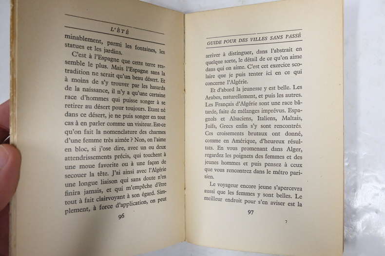 First edition, Service de presse-copy, i.e. review-copy (""S.P"" to bottom of title-page and to verso of back wrapper), of Camus' magnificent and highly influential collection of essays entitled ""Summer"", inscribed to the famous critic of literature and drama, the writer Guy Dumur (1921-1991): ""à Guy Dumur/ l'une des/ [ÉTÉ]s [ÉTÉ being printed an L' crossed out in front, with s added in Camus' hand]/ son vieil et fidele ami/ Albert Camus"" on half-title.The younger Guy Dumur was a close friend of Camus, who hired him to work on ""Combat"" with him. It is reported that he had a great talent for discovering new talent. Since childhood, he was extremely passionate about the theatre and came to work with all the great dramatic figures in Paris at the time. He is also famous for a number of well respected novels. The essays in ""L'été"" are devoted to Algiers and represent a very personal side of Camus, who provides a marvelous poetic and humorous picture of the provincial simplicities of Oran and Algiers. For many Camus-devotees, ""L'Été"" constitutes one of the most beloved works, as it gives the feel of a certain intimacy with the author that few of his other works does. ""In ""Return to Tipasa"", perhaps the most confessional essay in ""Summer"", which dates from a long trip to Algeria in December 1952, Camus issues his now famous testimony of survival - ""In the depths of winter, I finally learned that within me lay an invincible summer"" (Hawes: Camus, A Romance, 2009, pp. 181-82).