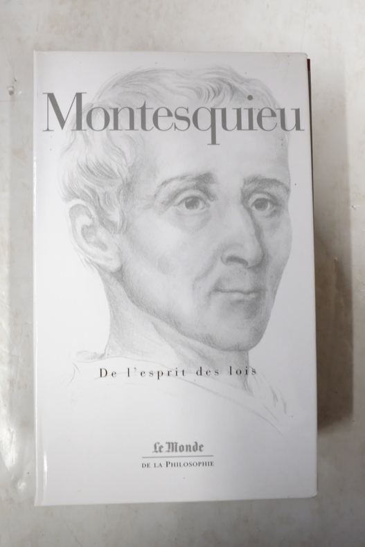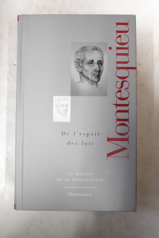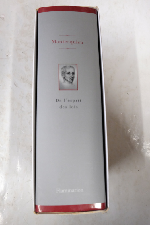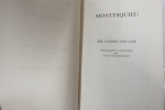 Paris DALIBON, LIBRAIRE, de l' imprimerie de L.-T. CELLOT 1822 huit volumes in-8°, XLVI 429, 442, 472, 526, 615, 456, 566 et 487 pp. Reliure de l' époque en demi-basane maroquinée vert, dos lisses ornés du titre, de tomaison, de guirlande, de filets et de fers romantiques doré.e.s. (volumes légèrement frottés, rousseurs). Portrait-frontispice de Montesquieu d'après Devéria gravé sur métal par H. C. Müller. Un fac-similé de lettre en début du tome premier. Tome I : Grandeur des Romains ; Tomes II, III et IV : Esprit des Lois ; : Tome V : Défense de l'Esprit des Lois ; Tome VI : Lettres Persanes ; Tome VII : Oeuvres diverses ; Tome VIII : Commentaire sur l'Esprit des Lois. Recherché.