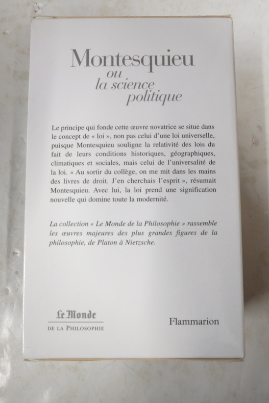 Comprend:I. Essai sur la vie et les ouvrages de Montesquieu, signé : D*** [Depping]. Éloge de Montesquieu, par d'Alembert. Éloge de Montesquieu, par Villemain. Considérations sur les causes de la grandeur des Romains et de leur décadence ; II. Analyse de "l'Esprit des lois" par d'Alembert. Analyse raisonnée de "l'Esprit des lois" par Bertolini. De l'Esprit des lois, I-X ; III. De l'Esprit des lois, XI-XXX ; V. De l'Esprit des lois, XXXI. Défense de "l'Esprit des lois". Réponse de M. de Risteau aux observations sur "l'Esprit des lois". Commentaire sur quelques principales maximes de "l'Esprit des lois", par Voltaire. Lettre d'Helvétius. Remerciement sincère à un homme charitable, attribué à Voltaire ; VI. Lettres persanes ; VII. Arsace et Isménie. Le Temple de Gnide. Essai sur le goût. Discours. Ébauche de l'éloge historique du maréchal de Berwick. Pensées diverses. Notes sur l'Angleterre. Poésies. Lettres familières ; VIII. Commentaire sur "l'Esprit des lois", par M. le Cte Destutt de Tracy, suivi d'observations inédites de Condorcet sur le 29e livre et d'un mémoire sur cette question : "Quels sont les moyens de fonder la morale d'un peuple" ? .......... Bonne édition des oeuvres de Montesquieu, la première à contenir le Commentaire de Destutt de Tracy, revu par l'auteur. Très complète, elle rend compte de la réception de Montesquieu du temps des Lumières (D'Alembert, François Risteau, Voltaire, Helvetius, Condorcet) et au début du XIXe. Le Commentaire sur L'Esprit des Lois de Destutt de Tracy, fut d'abord traduit en anglais et publié à Philadelphie par Jefferson en 1811. La première publication en français date de 1817 à Liège. Il forme ici l'intégralité du volume 8 avec : Quels sont les moyens de fonder la morale d'un peuple et les Observations de Condorcet. "Au système de Montesquieu, Destutt de Tracy oppose un plan de gouvernement républicain reposant sur le suffrage universel. C'est à l'époque redevenu une nouveauté. Il définit la liberté par le pouvoir d'exécuter ses volontés et, par là d'atteindre au bonheur" (D. Bagge, "Les idées politiques en France sous la Restauration", p. 150). (Brunet, III, 1859. Vicaire, V, 1104) ....... BELLE RELIURE ROMANTIQUE ...... TRÉS BIEN RELIÉ ............ EN TRÉS BON ÉTAT (very good condition). en trés bon état