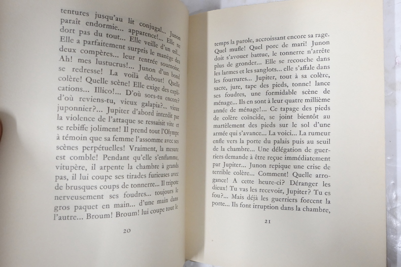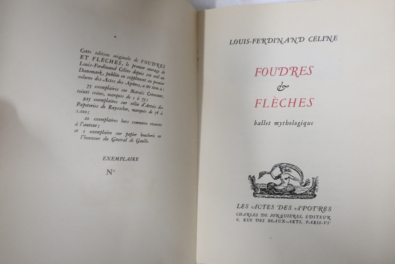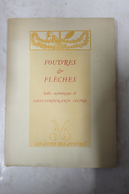 Paris, Les Actes des Apôtre / Charles de Jonquières 1948. In-12 broché de 84 pages au format 19,5 x 14,5 cm. Couverture à rabats avec titre imprimée et petite vignette illustré. Dos carré. Plats et intérieur frais malgré d'infimes traces d'adhésif aux pages de garde. Exemplaire non coupé. Ballet mythologique, dans lequel se croisent les foudres de Jupiter et les flèches de Cupidon sur le mont Olympe, illustré de vignettes et culs-de-lampe anciens non signés. Il s'agit du premier ouvrage composé par Louis-Ferdinand Céline pendant son exil au Danemark, dont il dut abandonner la rédaction le temps de son incarcération dans les prisons danoises, du 18 décembre 1945 au 23 mars 1947 ( tel qu'il le précisa sur le manuscrit ). Exemplaire du service de presse, avec carte d'un des membres de la Revue " Formes et Couleurs ", adressée à Charles de Jonquières afin d'obtenir ce livre en service de presse. pour Tirage limité à 1.021 exemplaires numérotés. Un des 925 exemplaires sur vélin d'Artois des Papeteries de Ruysscher ( n° 650 ). Rare édition originale, surtout dans un tel état de fraicheur.