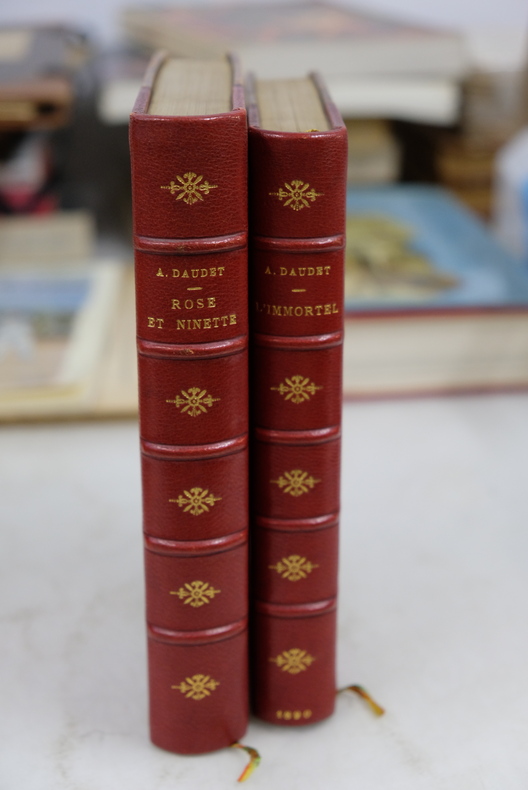 20 vol. grand in-8 reliure plein cartonnage rouge, dos à 4 nerfs, Oeuvres complètes illustrées (20 Tomes - Complet), Librairie de France, Paris, 1929-1931, Tome 1 : Les Amoureuses 1858. Précédé de Retour sentimental vers Alphonse Daudet, par Henri Beraud, 1930, 28-170-125 pp. ; Tome 2 : Le Petit chose, Histoire d'un Enfant 1868, illustrations de Adrien Bagarry, 1930, VIII-276 pp. ; Tome 3 : Lettres de mon Moulin, Impressions et Souvenirs 1873, et Lettre à un Absent, Paris, 1870-1871, illustrations de Andre Villeboeuf, VIII-212-184 pp. ; Tome 4 :Aventures prodigieuse de Tartarin de Tarascon, 1872, illustrations de Edy Legrand, Contes du Lundi, 1873, illustrations de Andre Villeboeuf et de Herve-Baille, Les Femmes d'Artiste, 1874, illustrations de C. Picart-le-Doux, 181-222-81 pp. ; Tome 5 : Fromont Jeune et Risler Ainé. Moeurs parisiennes, 1874, Illustrations de Jean Serriere, Etudes et paysages. Robert Helmont. Journal d'un Solitaire, 1870-1871, illustrations de Gerard Cochet, 1929, IX-310-V-224 pp. ; Tome 6 : Jack. Moeurs contemporaines 1876, Illustrations de Madame Preveraud de Sonneville, 1929, XII-498 pp. ; Tome 7 : Le Nabab. Moeurs parisiennes, 1887, illustrations de Berthold Mahn, 1930, IV-430 pp. ; Tome 8 : Les Rois en Exil, Roman parisien, 1879, Illustrations de J.-A. Stival, 1929, X-294 pp. ; Tome 9 : Numa Roumestan, Moeurs parisiennes, 1881, L'Evangeliste, Roman parisien 1883, illustration de Francois Quelvee illustrations de Yves Alix, 1929, 233-244 pp. ; Tome 10 : Sapho. Moeurs Parisiennes, 1884. illustrations d'Alfred Lombard, Tartarin sur les Alpes, Nouveaux exploits du heros tarasconnais, 1885, illustrations de Edy Legrand, 1931, 210-183 pp. ; Tome 11 : L'Immortel. Moeurs parisiennes, 1888, illustrations de Georges D'Espagnat, La Belle Nivernaise, Histoire d'un Vieux Bateau et de son Equipage, 1886, illustrations de Paul Gernez, 218-87 pp. ; Tome 12 : Trente ans de Paris à travers ma vie et mes livres, 1888, Souvenirs d'un homme de lettres, Préfaces, 1930, 141-146-27 pp. ; Tome 13 : Port-Tarascon, Dernières aventures de l'illustre marin, 1890, illustrations de Edy Legrand, Rose et Ninette, Moeurs du jour, 1892, illustrations de Jeanne Rosoy, Entre les frises et la rampe, Petites études de la vie théâtrale, 1894, 1930, 200-85-76 pp. ; Tome 14 : Vie d'enfant - Le Valet de Ferme, Oeuvres provençales de Baptiste Bonnet traduites par Alphonse Daudet, illustrations de Pierre Girieud, et Traductions diverses d'oeuvres provençales, 1929, X-125-162-37 pp. ; Tome 15 : La Petite Paroisse, 1895, illustrations de Rene Piot, Premier Voyage Premier Mensonge, 1900, illustrations de Feder, La Fedor Pages de la Vie, 1896, 1930, 252-50-84 pp. ; Tome 16 : Soutien de Familles, Moeurs contemporaines, 1898, Illustrations de A. de la Patelliere, Notes sur la Vie, illustrations de A.-F. Cosyns, 1929, III-147-304 pp. ; Tome 17 : La Doulou (La Douleur, 1887-1895, Le Tresor d'Arlatan, 1897, illustrations de Rene Piot, 1930, XI-65-50 pp. ; Tome 18 : Pages inédites de Critique dramatique, 1874-1880, Illustrations de Marcel Roche, 1930, 317 pp. ; Tome 19 : Théâtre I. La Dernière Idole, Les Absents, l'Oeillet blanc, Le Frère Aîné - Le Sacrifice - Lise Tavernier - L'Arlésienne - Fromont Jeune et Risler aine - Le char - Jack, 1930, 686 pp. ; Tome 20 : Théâtre II. Le Nabab - Sapho - Numa Roumestan - La Lutte pour la Vie - L'Obstacle - La Menteuse, 1931, 569 pp.