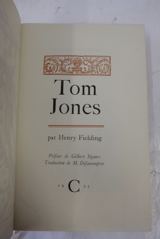 4 volumes grand in-8 (23,5 x 15 cm), demi maroquin brun à coins (reliure de l’époque), dos à nerfs joliment orné, double filet doré en bordure, tranche de tête dorée, xv-[1]-376 ; [4]-411-[1] ; [4]-356 ; [4]-444 pages (complet). Infimes frottements aux coins. Bon état. Nouvelle édition de la traduction française, illustrée de 12 gravures hors-texte, présentes en trois états. Henry Fielding (1707-1754) est un dramaturge, poète, essayiste et romancier anglais. Tom Jones devient très rapidement l'un des plus grands classiques de la littérature anglaise, figurant au sein de la liste de Maugham Somerset des dix plus grands romans. Fielding s'inspire de sa propre vie pour sa rédaction, et inclut notamment des traits de caractère de sa première épouse, Charlotte Craddock, décédée deux ans avant le début de sa rédaction. Agréable exemplaire.