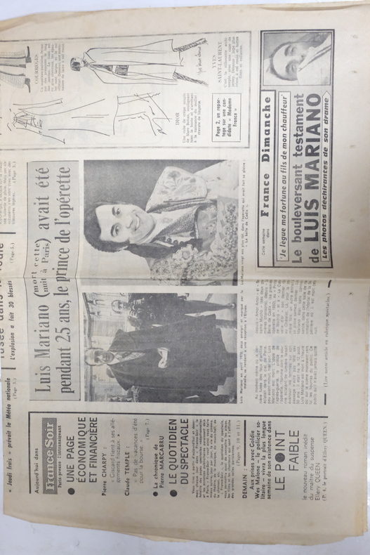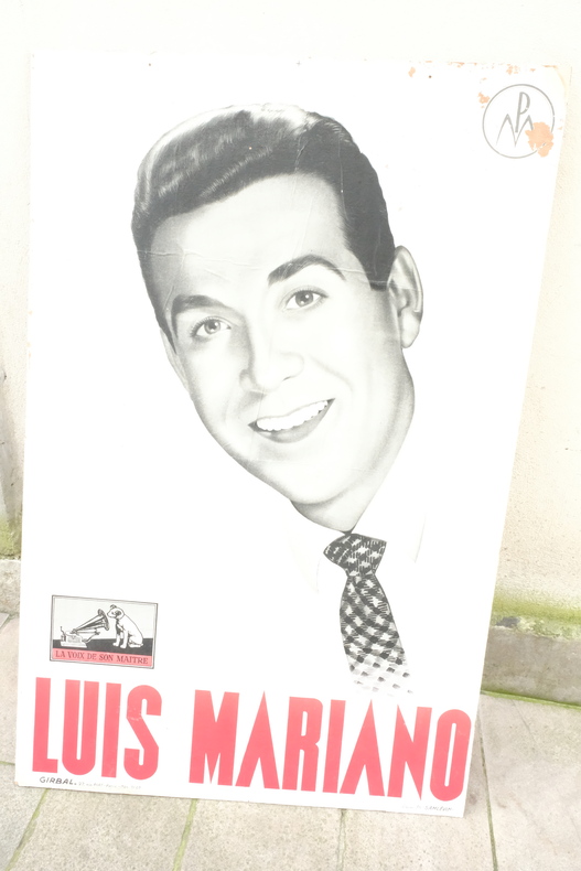 Plus d'une trentaines de documents autour de l'artiste basque Luis Mariano ( journaux, lettres, photos, publicités ) souvent atour de 1970. Notamment La république des Pyrénées, Paris-Jour, Le parisien, France-Dimanche , etc.., Les journaux sont parfois entiers, parfois découpés ou séparés des autres pages. Très bon état général. Deux affiches contrecollées sur petit contreplaqué probablement parues à l'occasion de la sortie d'un single et/ou d'un album, "La voix de son maître" ( 120 x 78 cm ) et "La caravelle d'or" ( 110 x 78 cm ), assez bon état.