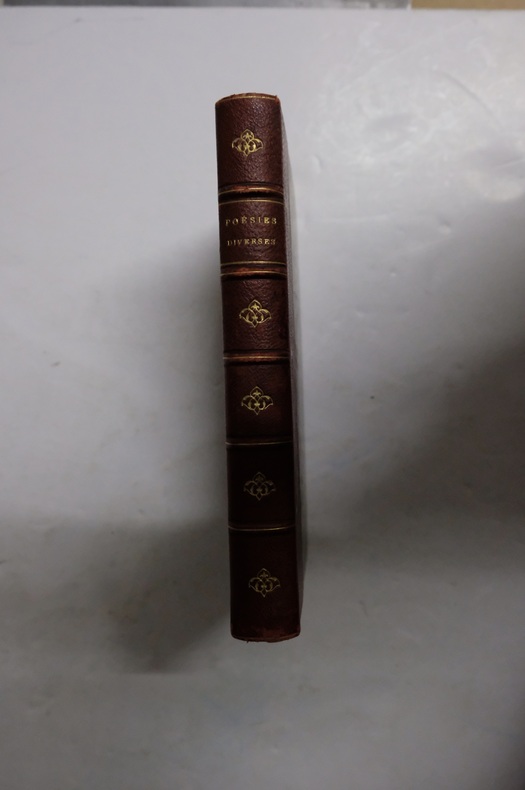Edition collective dédiée à la Duchesse de Berry et imprimée à 500 exemplaires sur beau papier, le nôtre un des 25 exemplaires numérotés sur hollande. Reliures à la bradel en demi maroquin de Russie fauve à coins, dos lisses ornés d'un cartouche doré richement décorés de fers romantiques dorés, dates dorées en queues, encadrements de filets dorés sur les plats de papier caillouté, gardes et contreplats de papier peigné, couvertures et dos conservés (sauf pour Poésies diverses de Charles Nodier relié sans dos ni couvertures et Poésies de madame Evelines Désormery relié avec ses couvertures mais sans le dos), élégantes reliures pastiches romantiques signées Carayon. Cette collection complète en huit volumes, publiée à l'initiative de Charles Nodier qui a préfacé tous les volumes, comprend les titres suivants: Voyage de Chapelle et Bachaumont, La Guirlande de Julie par M. de Montausier, Diverses poésies du Chevalier d'Aceilly, Conjuration du Comte de Fiesque par le Cardinal de Retz, Oeuvres choisies de Sénécé, Oeuvres choisies de Sarrasin, Madrigaux de Monsieur de la Sablière, Relation des campagne de Rocroi et de Fribourg par Henri de Bessé. On y a adjoint quatre volumes supplémentairesn'appartenant pas à cette collection : Fables de Fénelon (Rapilly, 1826), Poésies diverses de Charles Nodier (Delangle et Ladvocat, 1827), Poésies de madame Evelines Désormery (Delangle, 1828), Esquisses poétiques par Edouard Turquety (Delangle, 1829). Envoi autographe signé de Charles Nodierà Alphonse de Cailleuxsur la page de faux-titre de son volume de Poésies diverses en édition originale : «Si ce petit livre valait la peine d'être offert, je l'aurais offert à mon bon ami Alphonse de Cailleux.» Très bel ensemble en reliures uniformes romantiques signées de Carayon, l'un des plus importants relieurs de la fin du XIXe siècle. - Photographies et détails sur www.Edition-Originale.com -