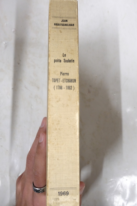 Bayonne. Société des Amis du Musée Basque de Bayonne. 1969. 593 pp. In-8. Broché. En bon état. 1 volume. Qui a dit que Baudelaire ou Verlaine était les seuls artistes maudits de leur temps? Certainement pas l'auteur de cette thèse de doctorat. Celui-ci évoque une figure de la poésie basque du XIXe siècle : Pierre Topet-Etchahun. Un personnage au destin particulier qui a pourtant su briller, exploitant des thèmes proche de ce Romantisme ayant marqué ce siècle.