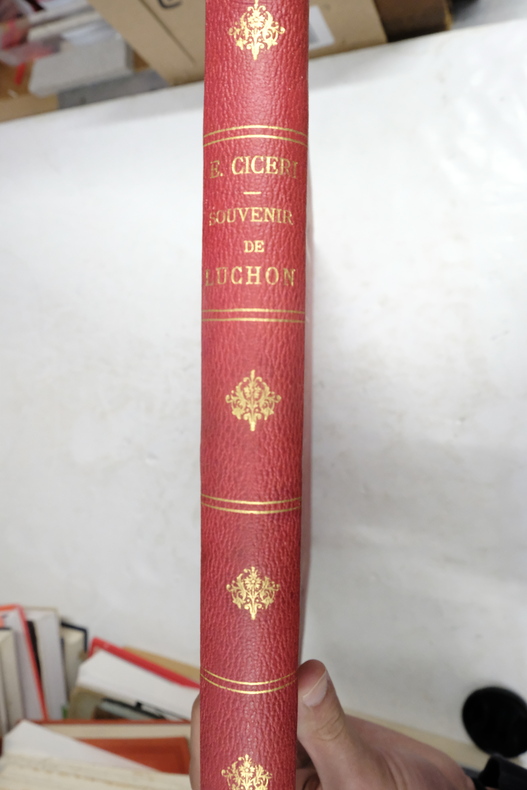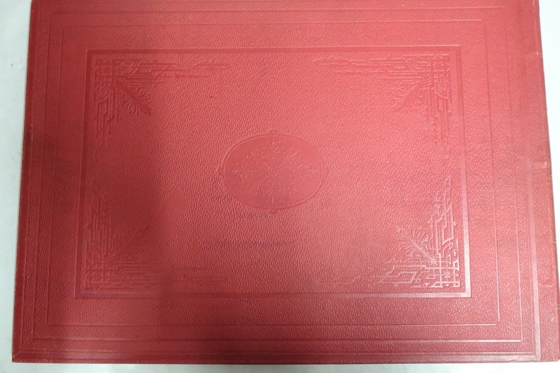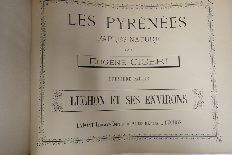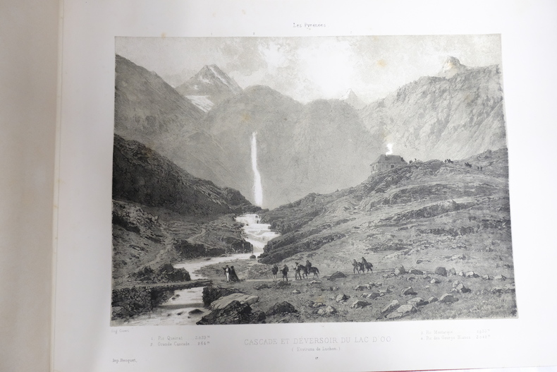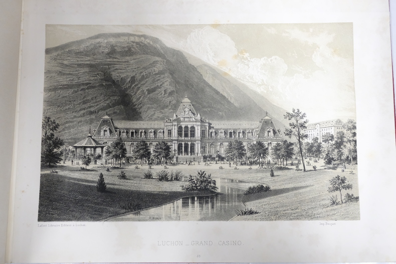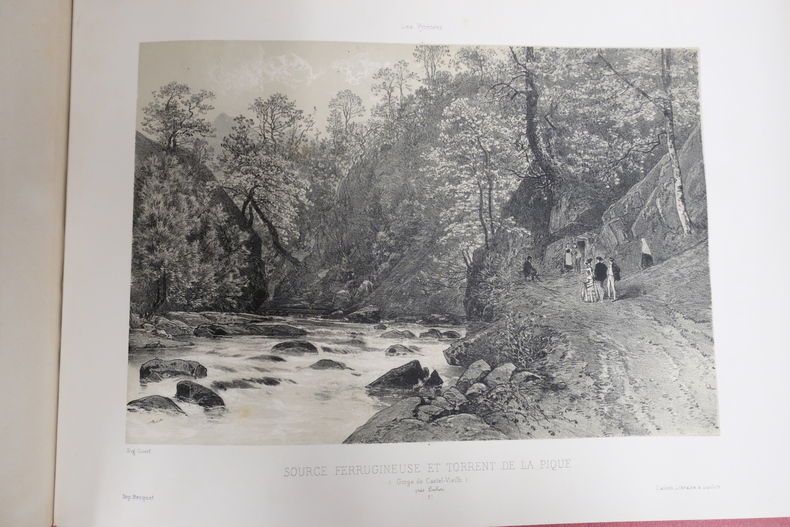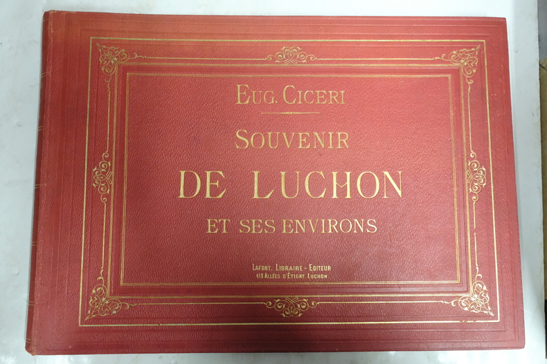Pleine toile rouge, dorures, in-folio, 29,5 x 41,5 cm, titre première partie + 8 pp de texte + carte dépliante de Luchon et ses environs + plan dépliante de Bagnères de Luchon + 27 planches dont 19 simples, 6 sur double page et 2 sur quatre pages, très bonne conservation, coins du dos légèrement émoussés, quelques rousseurs.