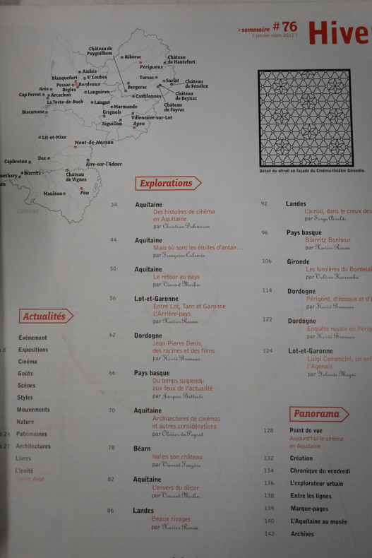 SOMMAIRE : Des histoires de cinéma en Aquitaine - Mais où sont les étoiles d'antan...- Le retour au pays - Entre Lot, Tarn et Garonne, L'Arrière-pays - Jean-Pierre Denis, des racines et des films - Du temps suspendu aux feux de l'actualité.... Classification Dewey : 908.447-Régionalisme : Aquitaine