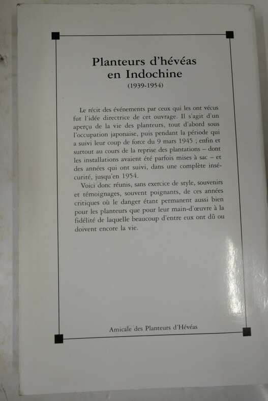 Le récit des événements par ceux qui les ont vécus fut l'idée directrice de cet ouvrage. Il s'agit d'un aperçu de la vie des planteurs, tout d'abord sous l'occupation japonaise, puis pendant la période qui a suivi leur coup de force du 9 mars 1945 ; enfin et surtout au cours de la reprise des plantations - dont les installations avaient été parfois mises à sac - et des années qui ont suivi, dans une complète insécurité, jusqu'en 1954. Voici donc réunis, sans exercice de style, souvenirs et témoignages, souvent poignants, de ces années critiques où le danger étant permanent aussi bien pour les planteurs que pour leur main-d'oeuvre à la fidélité de laquelle beaucoup d'entre-eux ont dû ou doivent encore la vie.