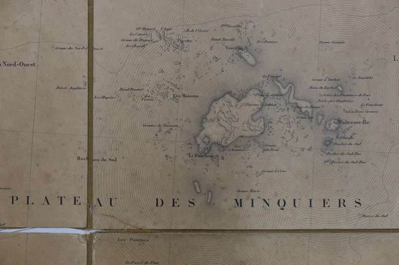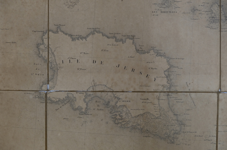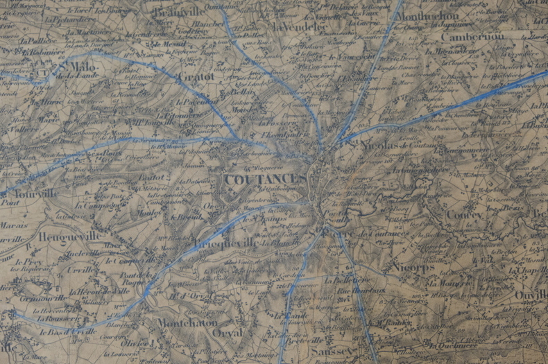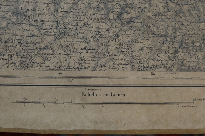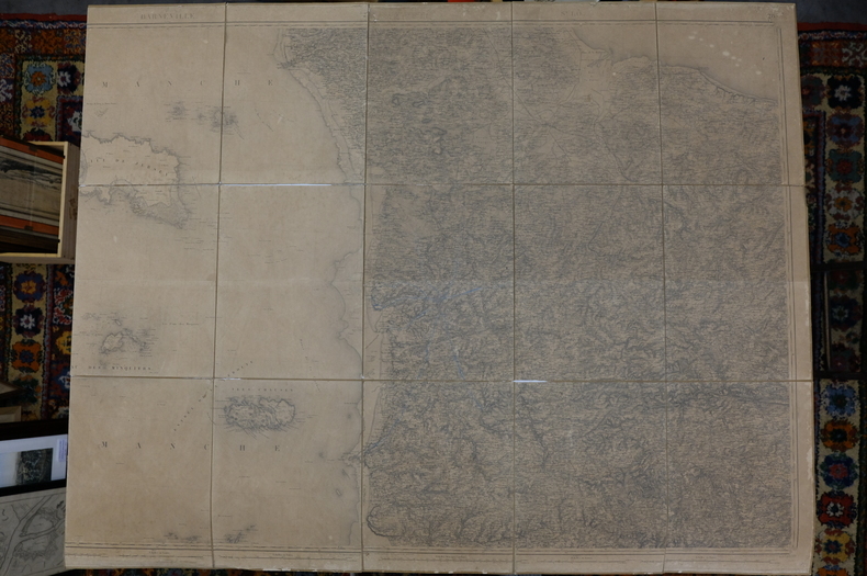 Carte gravée par Thuillier, lettrée par Hacq, dessiné par Leroy et les eaux réalisées par Rouillard. Carte de 1821 Dimension 111 x 168 cm. Dans son jus, papier bruni. Carte très fragile et déchirures entre certains morceaux, qu’il faudrait relier. C’est une très belle carte toilée d’époque avec image en très bon état. On peut y trouver l’île de Jersey ou encore Saint-Lô.