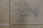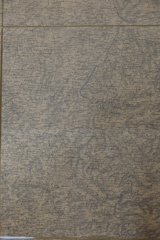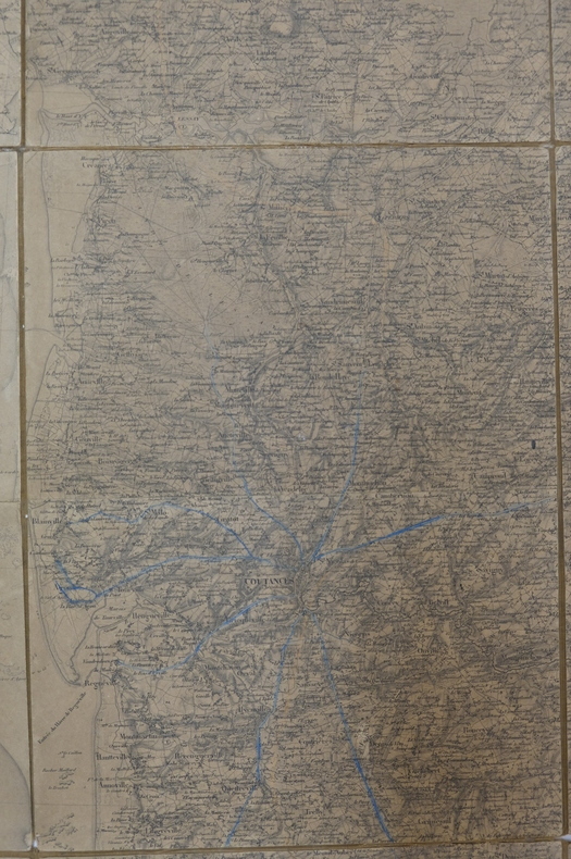 Feuille n°125/5 de la carte de Cassini, couvrant les côtes du Cotentin dans le département de la Manche, entre Fréval et Fermanville au nord, et Baubigny au sud. Elle montre également les îles Anglo-Normandes d'Aurigny, Burhou, Herms, et Sercq, orthographiée Cers. Il existe une autre version de cette Cassini sans les îles Anglo-Normandes. Elle s'étend au sud-est jusqu'à Urville et un hameau appelé Condargent. Les villes principales sont signalées à l'aquarelle rouge. Les routes et chemins sont aquarellés en rouge et en jaune. Seconde édition avec la double échelle en toises et en mètres. En 1793, la France déclare la guerre à la Grande-Bretagne et aux Provinces-Unies des Pays-Bas. La carte de Cassini est une source de renseignements pour la patrie, mais aussi pour l'ennemi. Sur ordre de la Convention, elle sera donc confisquée et transférée de l'Observatoire vers le Dépôt de la Guerre. Entre 1793 et 1818, les cartes seront retouchées et complétées par des graveurs supervisés par des ingénieurs géographes militaires. Entre 1803 et 1812, sont effectuées les principales modifications, principalement sur le réseau routier. C'est sur cette seconde édition que sera ajoutée une échelle en mètres à l'échelle en toises existante. Rare exemplaire sur lequel ont été ajoutés en manuscrit le nom du département Manche à l'encre rouge, les numéros des routes impériales puis royales (aujourd'hui routes nationales) à l'encre noire, et des routes départementales à l'encre rouge. La numérotation des routes royales et départementales (créées en 1811), a été modifiée en 1825. On remarque ainsi la route royale de première classe n°13, qui reliait Paris à Cherbourg et au fort de Querqueville, et que l'on voit ici entre Valognes et le fort de Querqueville, la route départementale n°18 entre Cherbourg et Beaumont, la route départementale n°3 entre Briquebec et Cherbourg, ou encore la route départementale n°4 entre Les Pieux et Pont Martin. La carte de Cassini est la première carte générale et particulière du royaume de France. En 1747, Louis XV décide de confier à César-François Cassini l'élaboration d'une carte de France, "particulière" - c'est-à-dire détaillée - et "générale", parce qu'elle doit couvrir tout le royaume. Les levés furent effectués entre 1756 et 1789, et les 182 feuilles composant la carte furent publiées entre 1756 et 1815. Trois générations de Cassini se succédèrent pour achever ce travail, principalement César-François Cassini de Thury dit Cassini III (mort en 1787) et son fils Jean-Dominique Cassini de Thury dit Cassini IV. Cette carte constituait pour l'époque une véritable innovation et une avancée technique décisive. Elle est la première carte à s'appuyer sur une triangulation géodésique dont l'établissement prit plus de cinquante ans. La carte de Cassini ne sera pas remplacée avant 1866, avec la carte d'État-Major à l'usage des militaires. Bel et rare exemplaire finement aquarellé à l'époque. Mouillure claire au niveau de l'île de Burhou.