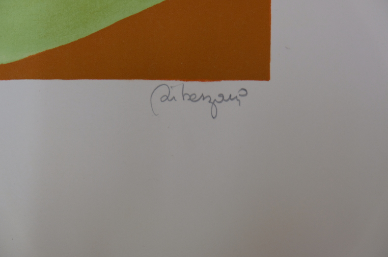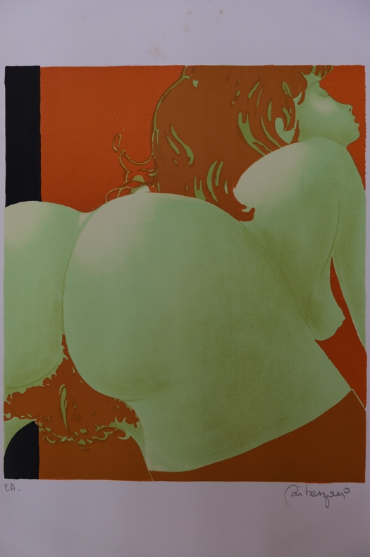 Dimension extérieur 65 x 47,4 et image 30,7 x 26,8 cm. Magnifique lithographie couleur réalisée par Daniel Riberzani, qui joue habilement sur la mise en avant de couleurs flash mais peu nombreuses. Lithographie érotique des années 70, pop art. Epreuve d'artiste. En très bon état général.