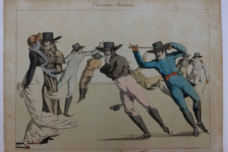 Dimension extérieur : 21,4 x 26,7 et image 17 x 23,8. Gravure en bon état malgré certaines epidermures et rousseurs. On peut observer une trace de scotch au verso. Les couleurs restent vives et agréables. Cette lithographie peut, au souhait du client, être nettoyée par un collaborateur professionnel, pour un prix variant de 20 à 30 euros. Les Incroyables et Merveilleuses sont un courant de mode de la France du Directoire caractérisé par son extravagance en réacton à la période sombre de la Terreur.