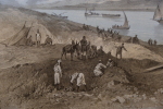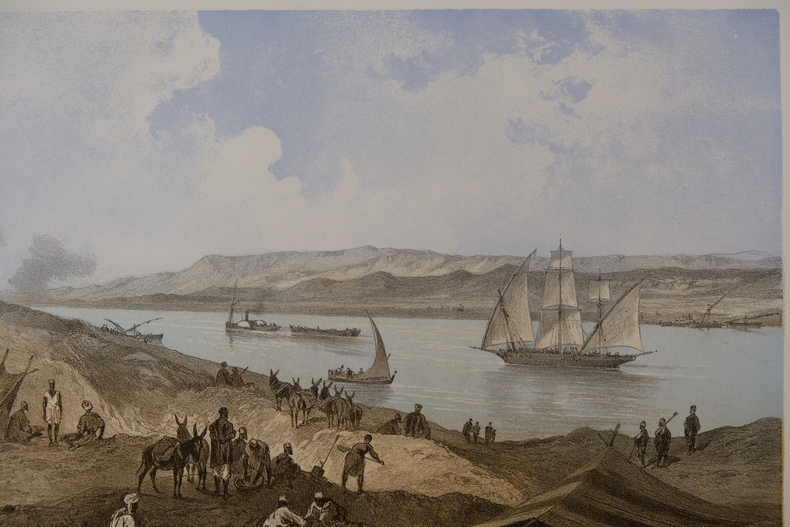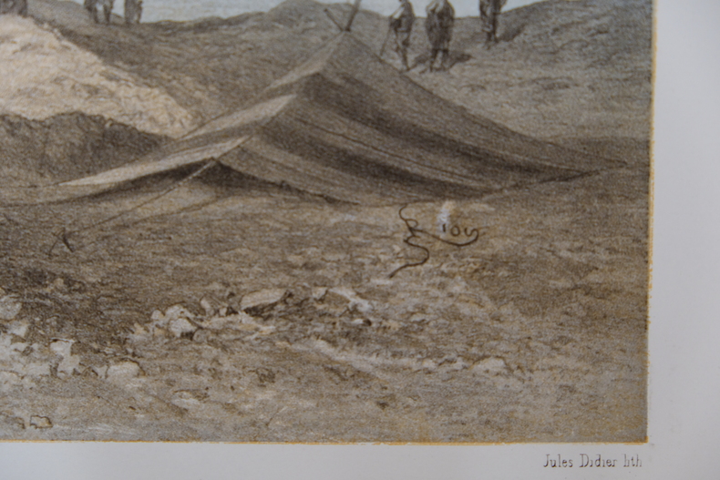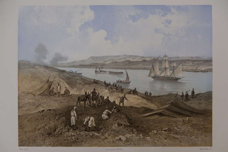 Dimension extérieur 36,9 x 44,5 cm et image 21 x 28,6 cm. Lithographie en très bon état, nettoyée. Peint par Edouard Riou (1833-1900) et lithographie réalisée par Jules Didier (1831-1914). Cette lithographie de 1869 propose les travaux réalisés pour le canal de Suez.