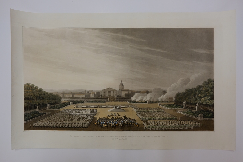 Cérémonie religieuse des armées alliées, place de la Concorde (place Louis XV) après la première abdication de Napoléon Source : Paris musée collection. Religious ceremony of the allied armies, Place de la Concorde (Place Louis XV) after Napoleon's first abdication Source: Paris museum collection.