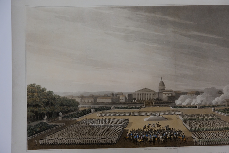 Evenèment du 10 avril 1814 Estampe réalisée en aquatinte autour de 1816. Dimension extérieur 37 x 60 cm et image 27,7 x 51,5 cm D’après un dessin original fait sur place pendant la cérémonie par Moreau. Nettoyé, en très bon état hormis une marque de pliure verticale au centre. Event of April 10, 1814 Print made in aquatint around 1816. External dimension 37 x 60 cm and image 27.7 x 51.5 cm Based on an original drawing made on site during the ceremony by Moreau. Cleaned, in very good condition except for a vertical crease mark in the center.