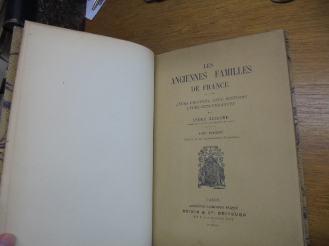 Bon état - "Les anciennes familles de France - Leurs origines, leur histoire, leurs descendances." Paris, Boivin & Cie, 1930, In-4, 119 pages, reliure demi-cuir, dos à 5 nerfs avec titres dorées.