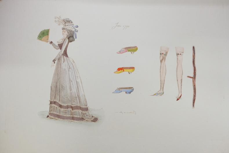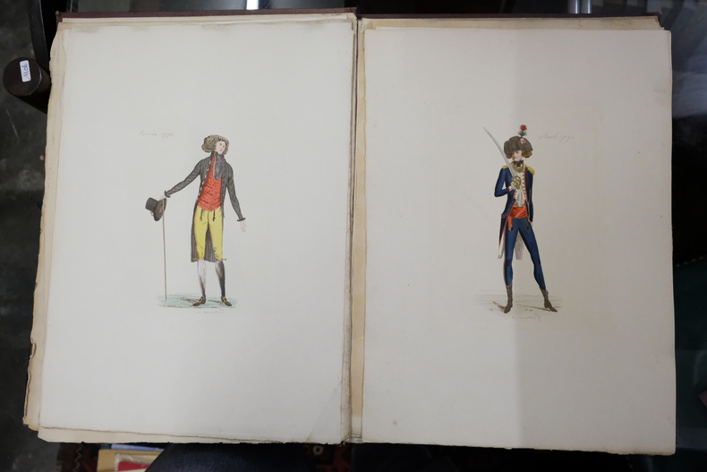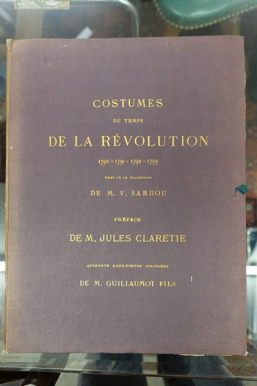 Ouvrage exceptionnel. Deux volumes datant de 1876 et intitulés Costumes du temps de la Révolution. Ravissant porte feuille cartonné sous toile. En une soixantaine d’eaux fortes coloriées, toutes datées de 1790 à 1806, suivez l’évolution de la mode à travers les grands bouleversements politiques et sociaux de la fin du XVIIIème siècle. Les gravures sont réalisées selon les techniques de l’époque représenté, au burin et sur un papier à la cuve traditionnel, signées Auguste-Alexandre Guillaumot (1815-1892). Tirées de la collection du célèbre dramaturge et précurseur de l’art médiumnique Victorien Sardou, ces gravures sont brillament introduites par un texte de son ami le romancier Jules Claretie, tous deux membres de l’Académie française. L’ouvrage date de 1876 et il est plutôt en bon état pour son âge. L’un des deux volumes présente seulement une hachure sur la couverture. Deux gravures sont tâchées et enfin, huit sont manquantes. Pièces à l'unité également disponibles, encadrées pour certaines. Nous contacter pour plus d'informations.