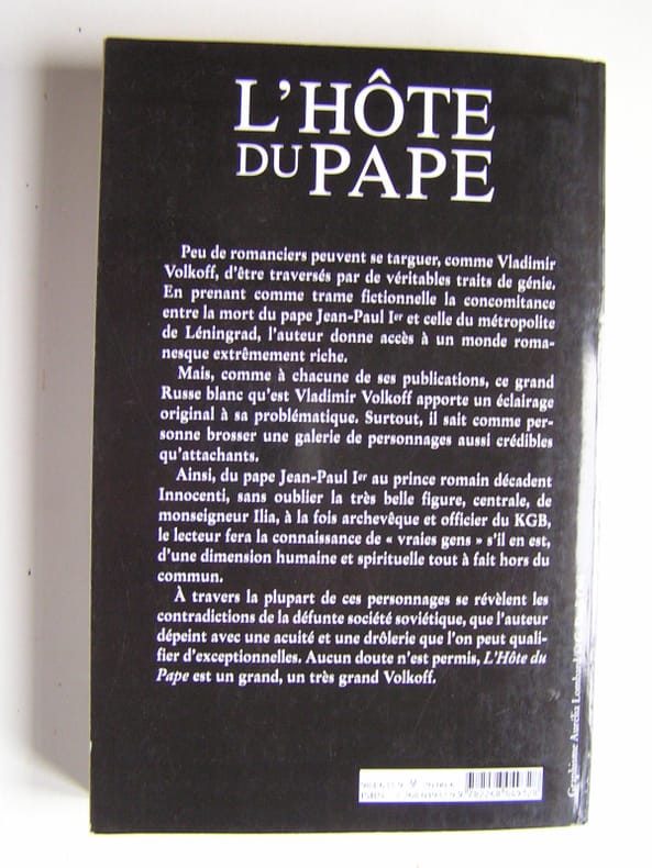 Un grand roman qui, construit autour de la mort de Jean-Paul I et celle, concomitante, du Métropole de Léningrad, nous entraine dans les grandes manoeuvres du KGB, les intrigues du Vatican mais également dans le secret des coeurs. Dans la lignée des grands romans de Volkoff qui nous conduit de main de maître dans les arcanes de société et de la pensée russe. Peut-être un des meilleurs.