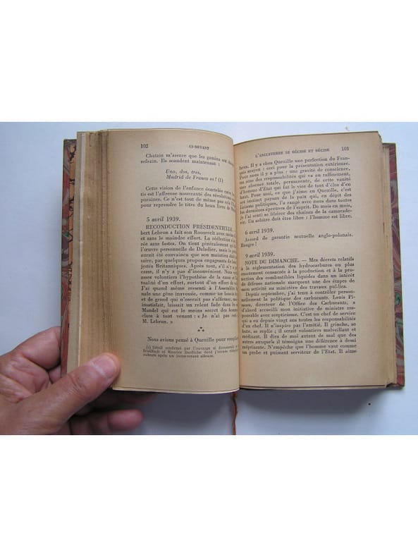 Le journal d'Anatole de Monzie tenu du 21 août 1938 à octobre 1940: période où il est aux affaires dans les gouvernements de la Troisième République, où il vote les pleins pouvoirs au Maréchal Pétain mais où progressivement il se détache de Vichy. Journal intéressant qui montre la démarche d'un socialiste qui ˮIl fallait sauver ce qui pouvait être sauvéˮ mais qui demeure très critique. Edition de 1941 établie dans une agréable reliure en demi basane brune (premier plat de couv conservé), dos plat avec auteur, titre et motifs or, tranche de tête dorée, en bon état (dos légèrement insolé et coiffes légèrement frottées). Intérieur bien propre malgré les pages un peu jaunies.