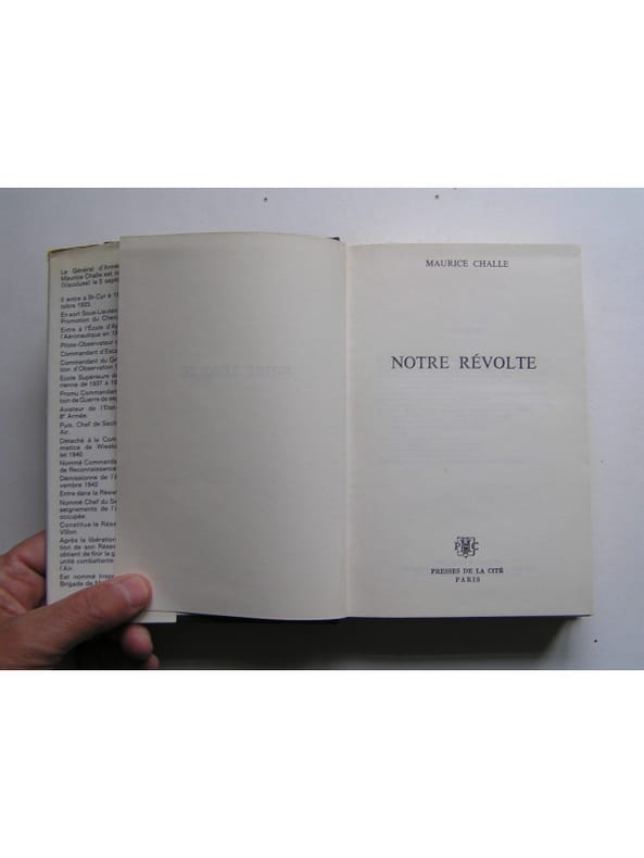 État : Bon état - Année : 1968 - Format : in 8° - Pages : 445pp - Editeur : Presses de la Cité - Lieu d'édition : Paris - Type : Cartonnage toile éditeur, jaquette illustrée - Divers : Jaquette un peu élimée aux franges. Cartonnage un peu taché aux franges. Tranches un peu salies avec de pâles rousseurs. Intérieur bien propre. - Commander rapidement : https://www.bons-livres.fr/livre/general-maurice-challe/10164-notre-revolte?lrb