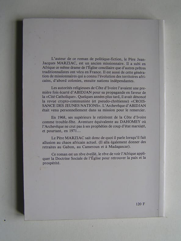 Ce roman est un rêve éveillé, le rêve de voir l'Afrique appliquer la Doctrine Sociale de l'Eglise pour retrouver la paix et la prospérité. Sous une forme romancée, une excellente approche des problèmes qui rongent l'Afrique et une solution qui n'est pas aussi irréaliste qu'il n'y paraît. Le père Marziac, missionnaire en Côte d'Ivoire pendant de nombreuses années, est maintenant bien connu pour les exercices de Saint Ignace qu'il donne à Caussade.