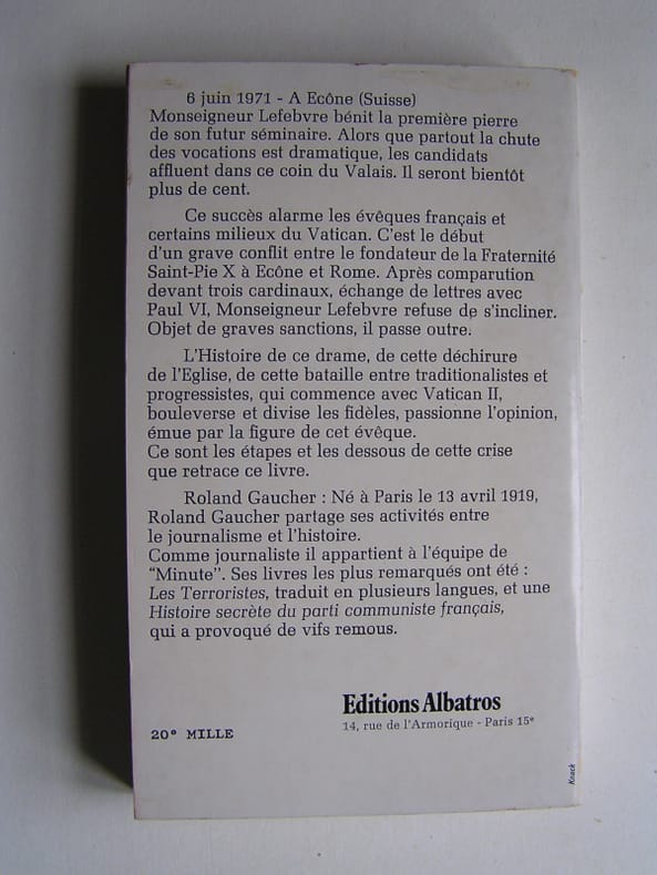 Avec un envoi de Roland Gaucher. 6 juin 1971 - A Ecône (Suisse). Monseigneur Lefèbvre bénit la première pierre de son futur séminaire. Alors que partout la chute des vocations est dramatique, les candidats affluent dans ce coin du Valais. Ils seront bientôt plus de cent. Ce succès alarme les évêques français et certains milieux du Vatican. C'est le début d'un grave conflit entre le fondateur de la Fraternité Saint-Pie X à Ecône et Rome. l'histoire de ce drame, de cette déchirure de l'Eglise, de cette bataille entre traditionalistes et progressistes, qui commence avec vatican II, bouleverse et divise les fidèles, passionne l'opinion, émue par la figure de cet évêque. Un page de notre histoire qui n'est pas encore fermée.